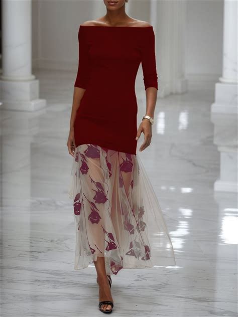 Wine Red Floral Rose Knit Off The Shoulder Half Sleeve Mermaid Maxi Dress, US10