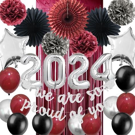 Maroon Black And Silver Graduation Decorations Class Of 2024 Graduation Party Supplies Burgundy Balloons Foil Fringe Curtains Proud Of You Banner For College School