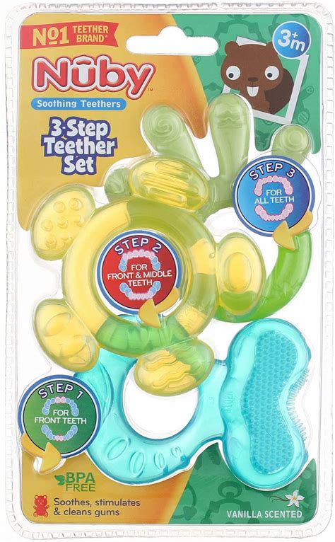 Nuby 3-Step Soothing Teether Set for Infants, Green/Blue/Yellow Uni