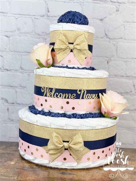 Blush Navy Gold Rose Diaper Cake, Baby Girl Pink Navy Girly Floral Diaper Cake, Virtual Drive By Baby Shower Centerpiece Decor Gift, 3 Tier